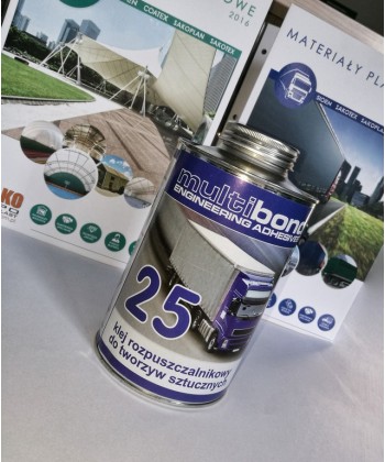 Klej do plandek i folii. Bezbarwny klej do plandek – MULTIBOND 25 stworzony na bazie poliuretanu oraz środków modyfikujących roztwory rozpuszczalników. Posiada wydłużony czas montażu oraz szeroki zakres zastosowań warsztatowych. Łączy gumy poliuretanowe PCV, PUR, piankę PE, skórę, EPDM, metale i drewno. Dostępny również w małej tubce.