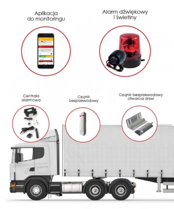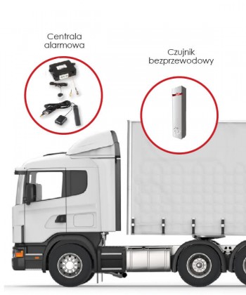 2. zabezpieczenie elektroniczne – centrala alarmowa wyposażona w bezprzewodowe czujniki monitorujące stan plandeki, drzwi naczepy i wybrane dodatkowe miejsca.
